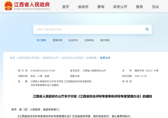 近日,江西省人民政府办公厅正式印发《江西省综合评标专家库和评标专家管理办法》,该办法将于2026年2月1日起实施。作为规范全省评标活动、整合专家资源的核心政策,新规明确评标专家终身负责等关键要求,通过完善入库审核、随机抽取、继续教育等全流程管理,进一步筑牢招投标领域公平公正底线,为优化营商环境、保障项目质量提供坚实制度支撑。